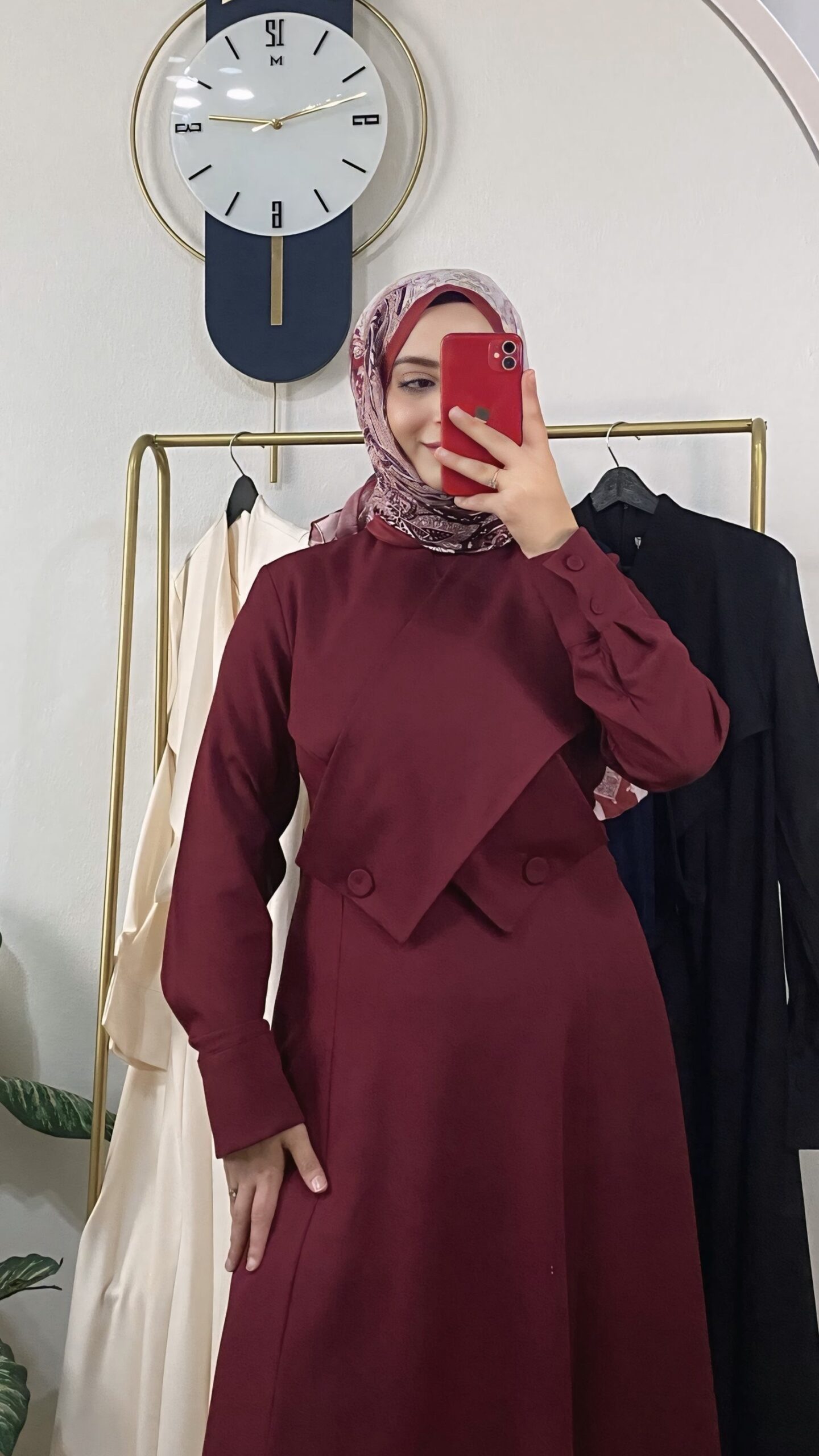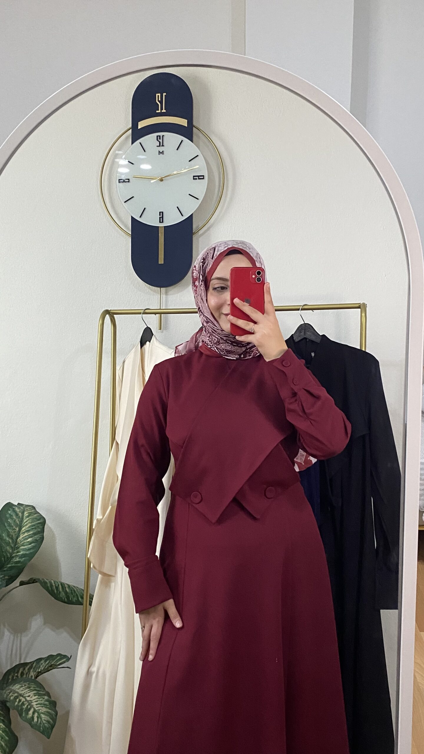 Özellikleri: Bisiklet yaka, önü çapraz detaylı, fermuarlı, astarsız krep uzun elbise.
