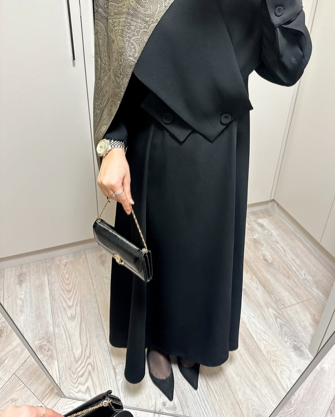 Özellikleri: Bisiklet yaka, önü çapraz detaylı, fermuarlı, astarsız krep uzun elbise.